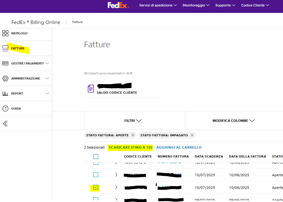 andare su "FATTURE" e selezionare la fattura da scaricare con "SCARICARE (FINO A 10)":