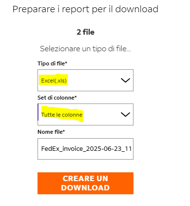 Selezionare2Tipo di file*" = Excel (.xls) e "Set di colonne" = Tutte le colonne